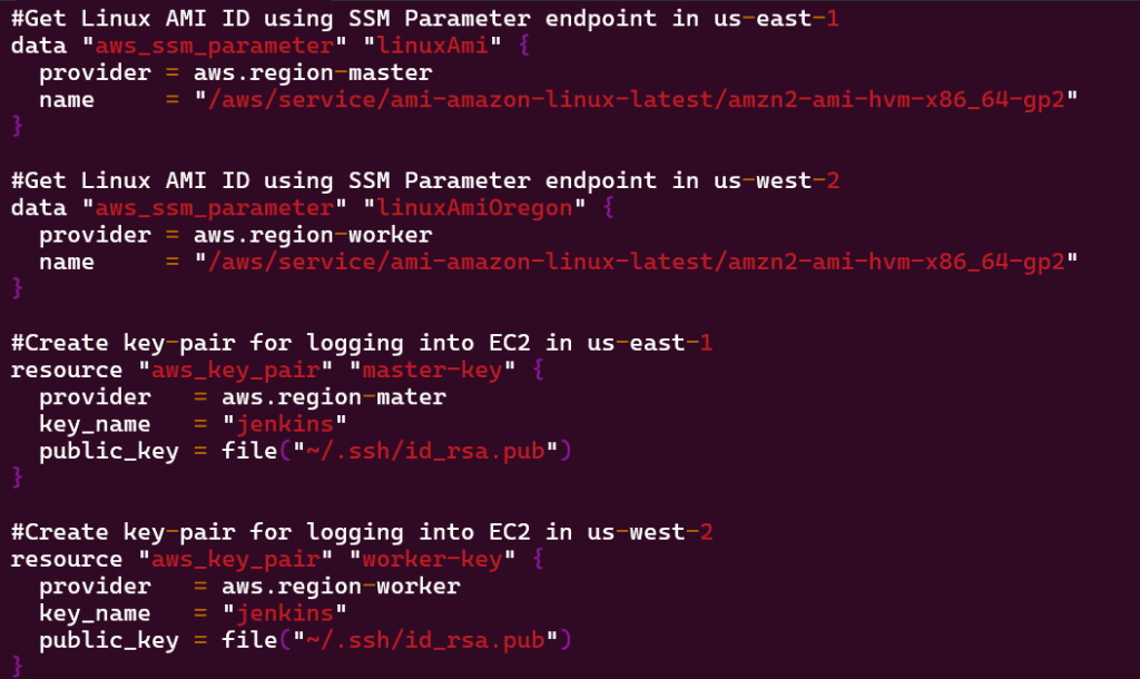 • #Get Linux AMI ID using SSM Parameter endpoint in us-west-2 data “aws_ssm_parameter” “linuxAmiOregon” { provider = aws.region-worker name = “/aws/service/ami-amazon-linux-latest/amzn2-ami-hvm-x86_64-gp2” }