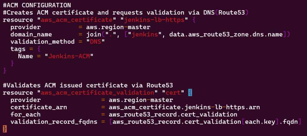 • Create acm.tf for certification requests to be validated via DNS route 53