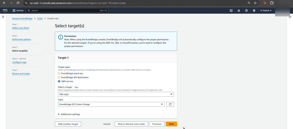 Create Amazon EventBridge rule to trigger SNS when EC2 state changes“