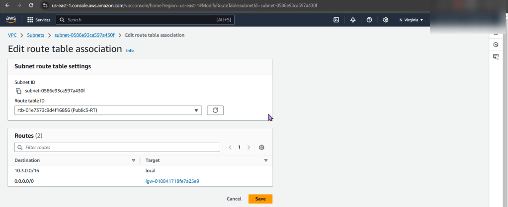 • Here we edit the route table association & then notice the difference in the route table permitting connection/traffic