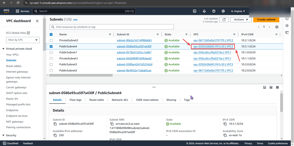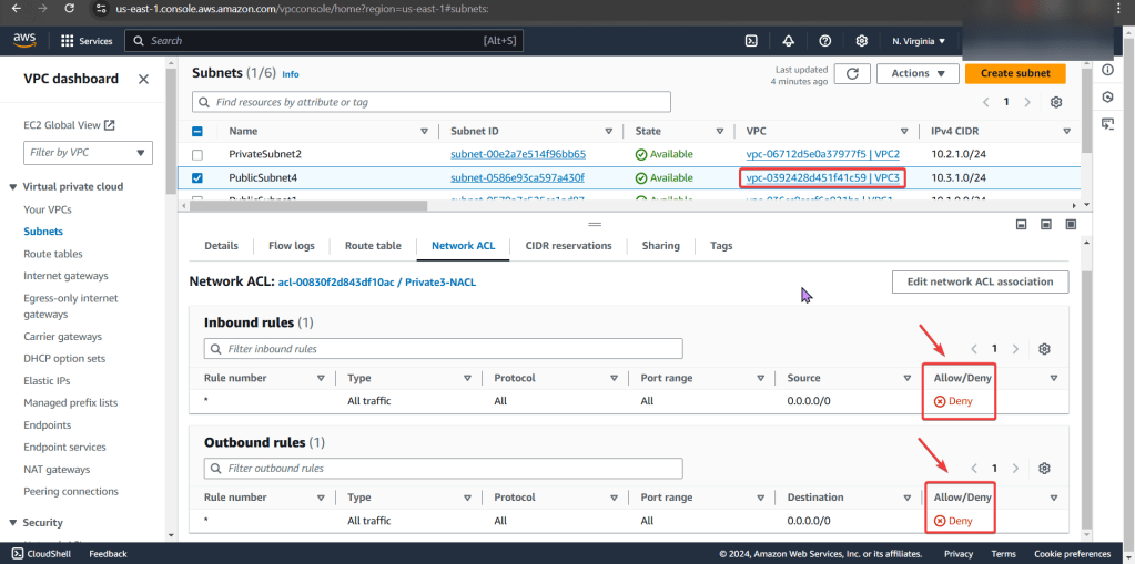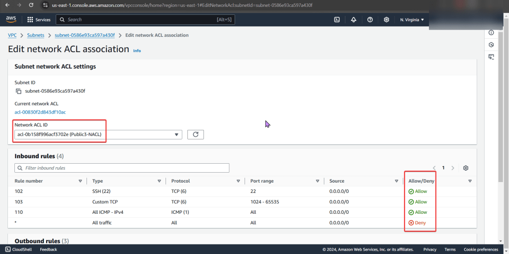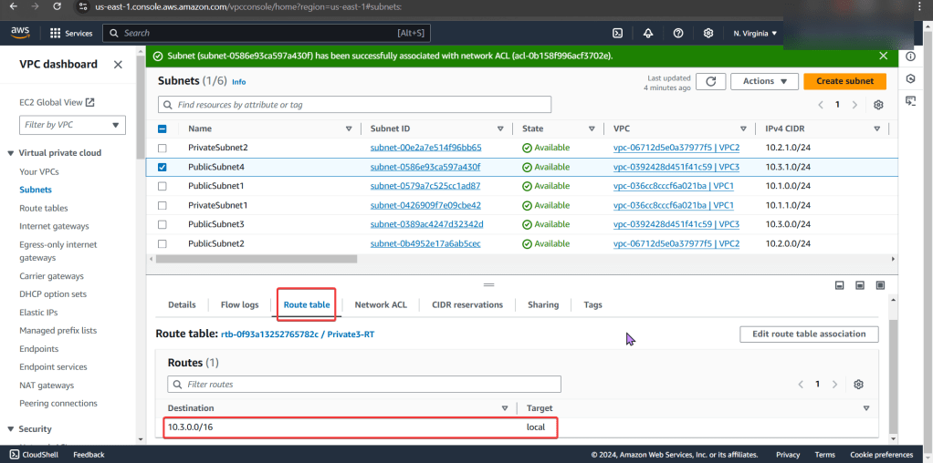 • Under public-subnet4 (which was the original VPC ID we had for instance 3), select edit network ACL association, & change to the NACL to the public-subnet3