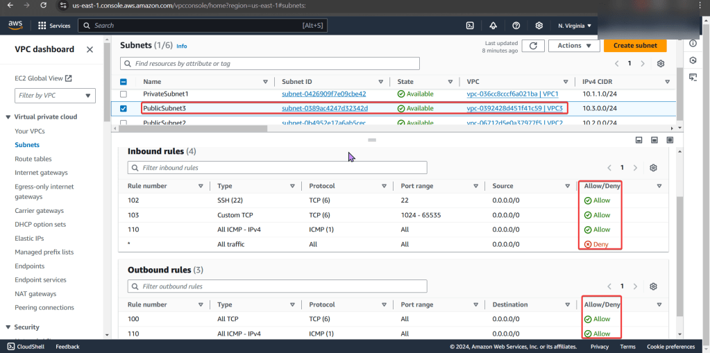 • We have 3 VPCs w/SSH connection & NACLs configured through route table