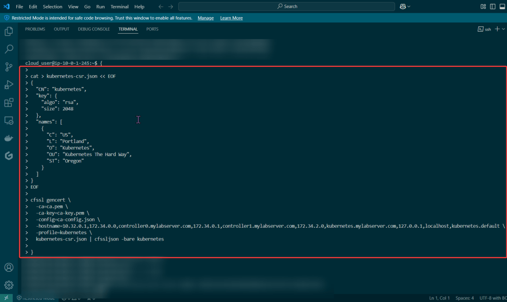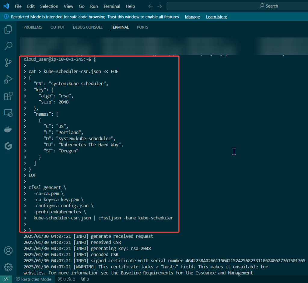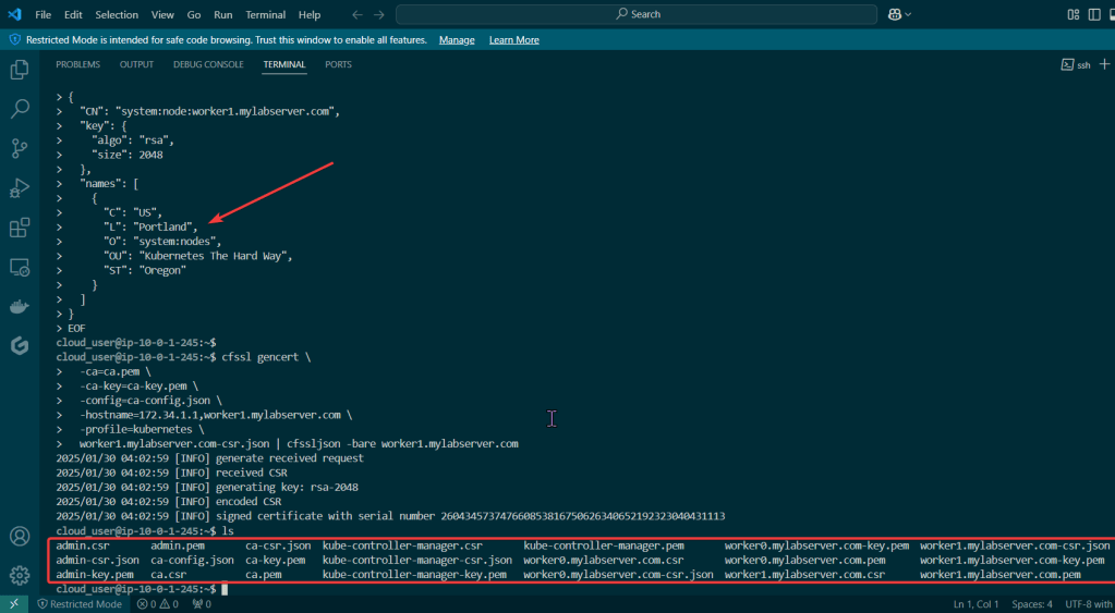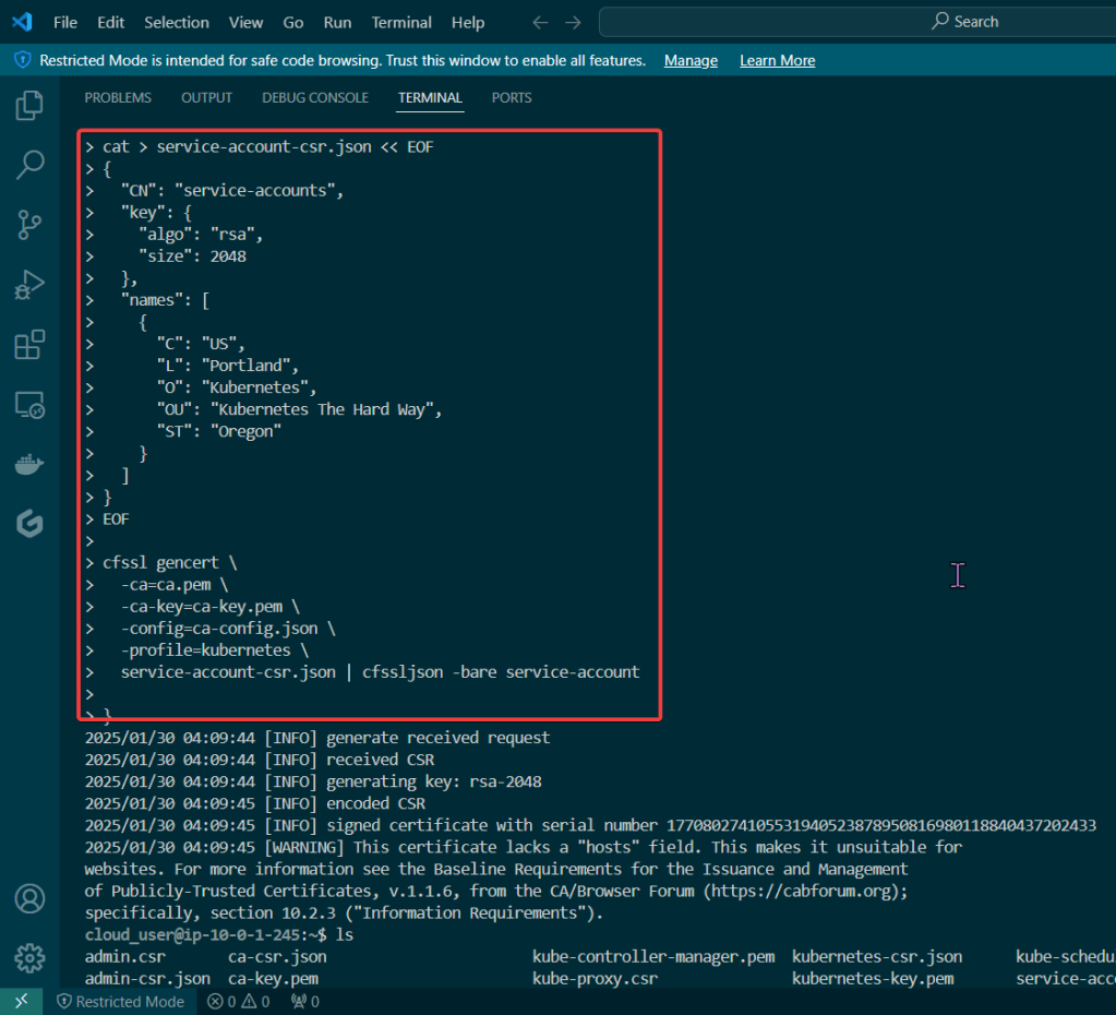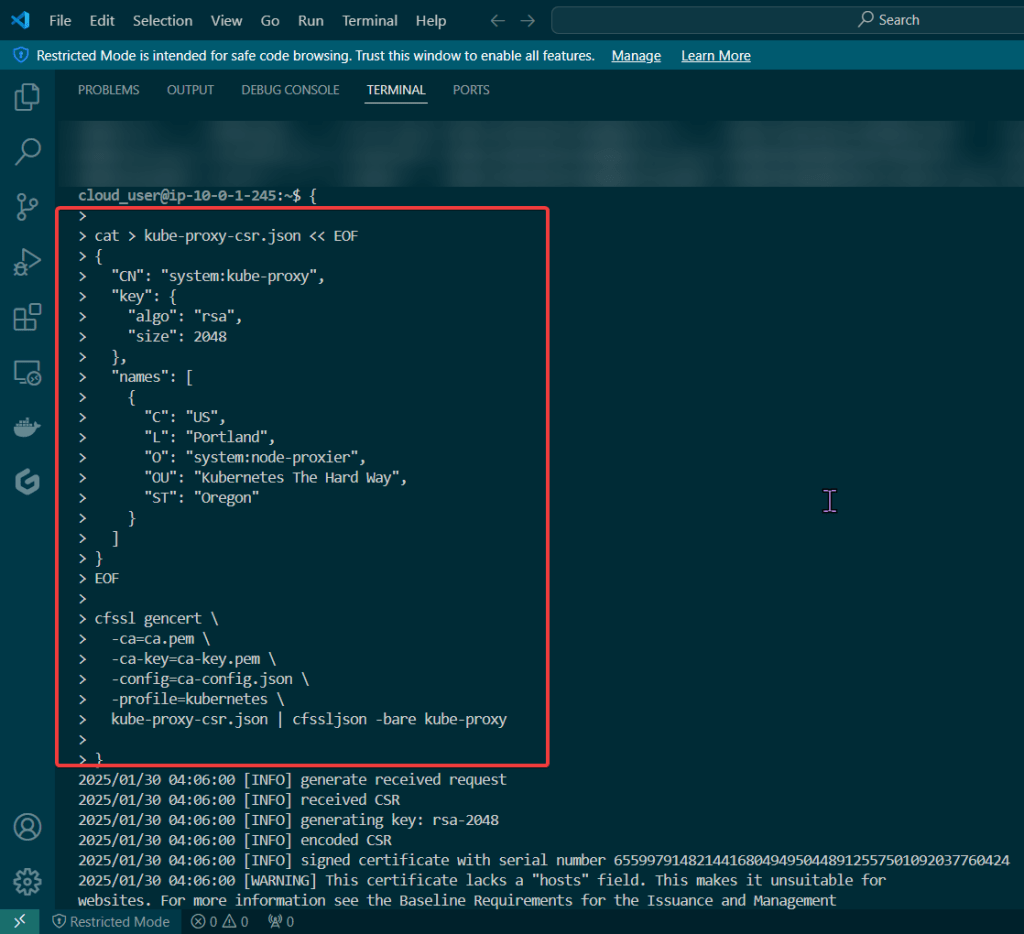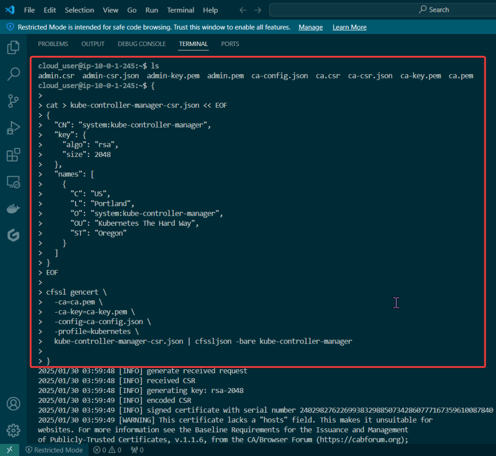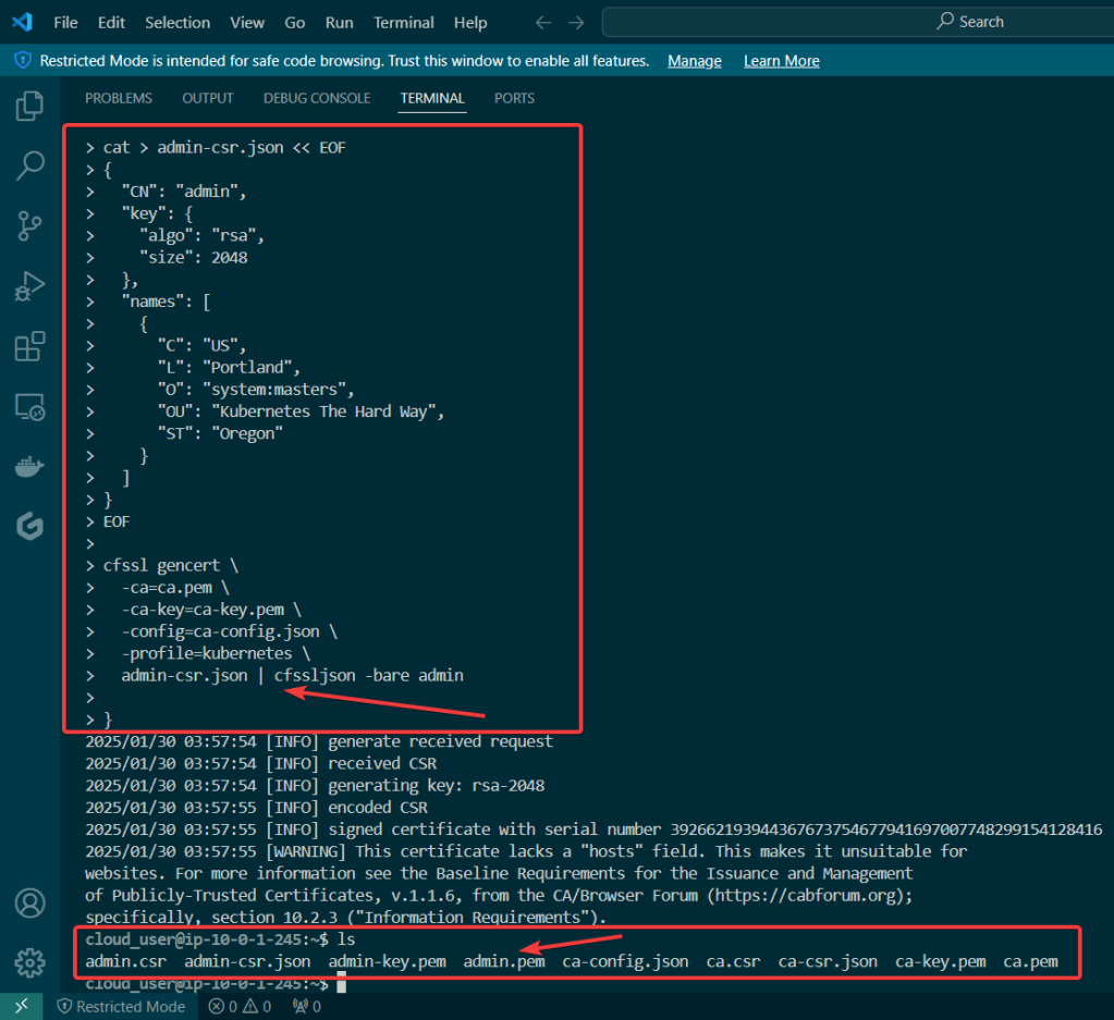 - Create Kubernetes client certs & kubelet client certs for two (2) nodes:
