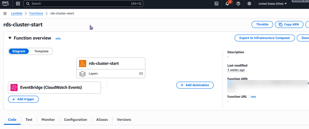 aws_iam_role.rds_stop_lambda_roleandaws_iam_role_policy.rds_stop_lambda_policy: These define the necessary permissions for the Lambda function to interact with RDS and CloudWatch Logs.aws_lambda_function.rds_stop_lambda: This resource defines the Lambda function itself, including its runtime, handler, associated IAM role, and the zipped code. It also passes theRDS_INSTANCE_IDENTIFIERandREGIONas environment variables for the Python script.aws_cloudwatch_event_rule.rds_stop_schedule: This creates a scheduled EventBridge rule using a cron expression.cron(0 0 ? * SUN *)schedules the execution for every Sunday at 00:00 UTC. Adjust this cron expression as needed for your desired 7-day interval and time.aws_cloudwatch_event_target.rds_stop_target: This links the EventBridge rule to the Lambda function, ensuring the function is invoked when the schedule is met.aws_lambda_permission.allow_cloudwatch_to_call_lambda: This grants EventBridge the explicit permission to invoke the Lambda function.- Lambda Function: A Python-based Lambda function that uses the AWS SDK (boto3) to stop the specified RDS instance(s).