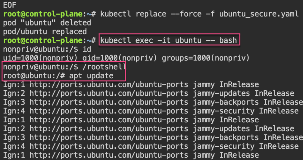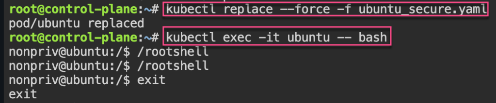 Security: 1st – create yaml file for ubuntu & can shell into root. 2nd – update spec for non-priv user & can escalate priv, 3rd – add spec to not allowed in escalating priv.